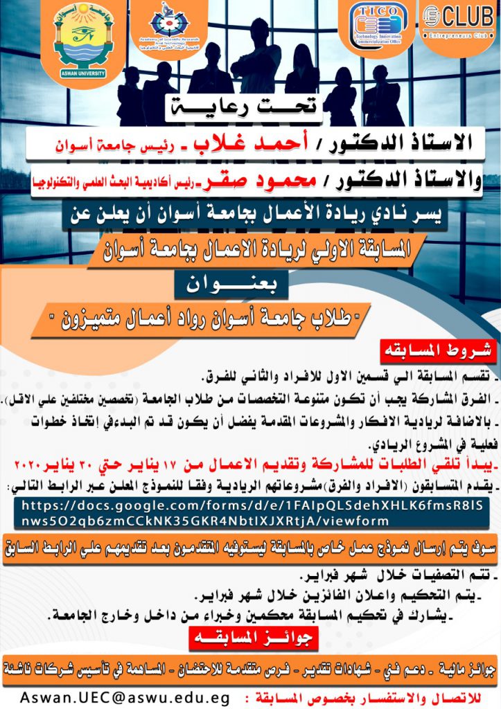 وياتي ذلك في إطار تشجيع الطلاب علي التميز وخلق أفكار جديدة للإبتكار ويسر نادى ريادة الأعمال بجامعة أسوان أن يعلن عن المسابقة الأولى لريادة الأعمال لطلابها .