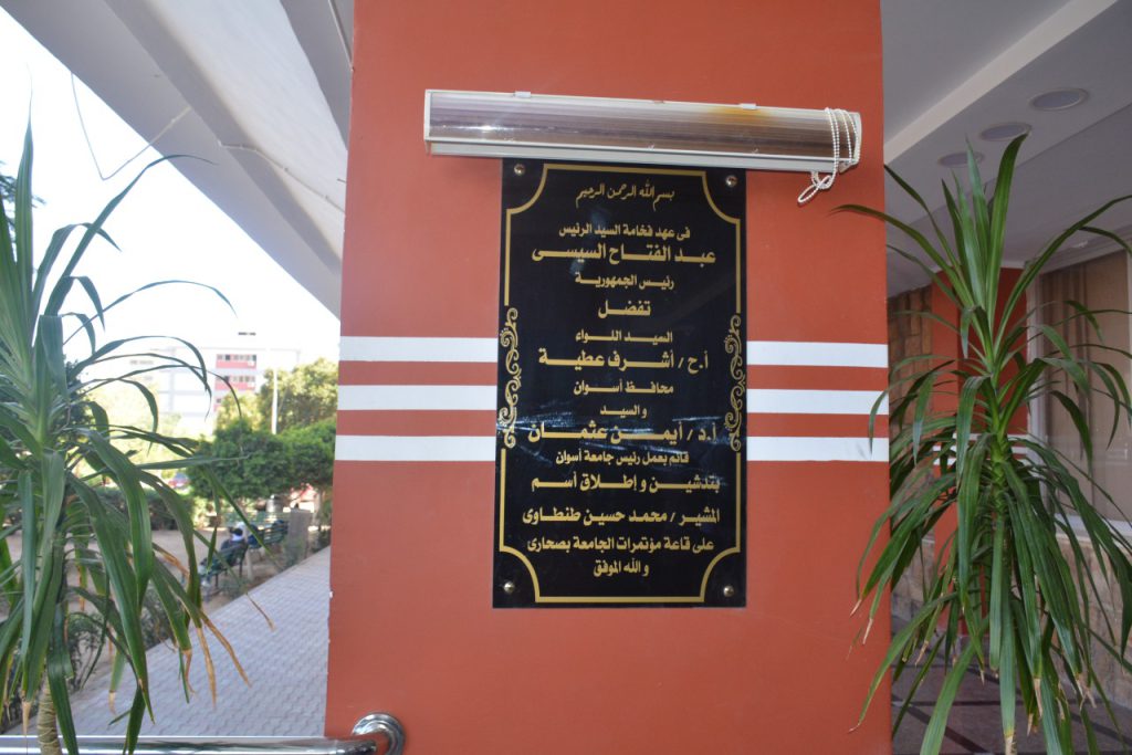تدشين وإطلاق أسم المشير/ محمد حسين طنطاوى على قاعة مؤتمرات الجامعة بصحارى، وذلك تحت رعاية اللواء/ أشرف عطية – محافظ أسوان والأستاذ الدكتور/ أيمن محمود عثمان – القائم بأعمال رئيس جامعة أسوان وبحضور العميد/ علاء رماح – قائد قطاع أسوان العسكرى وعمداء الكليات ومستشارى رئيس الجامعة.