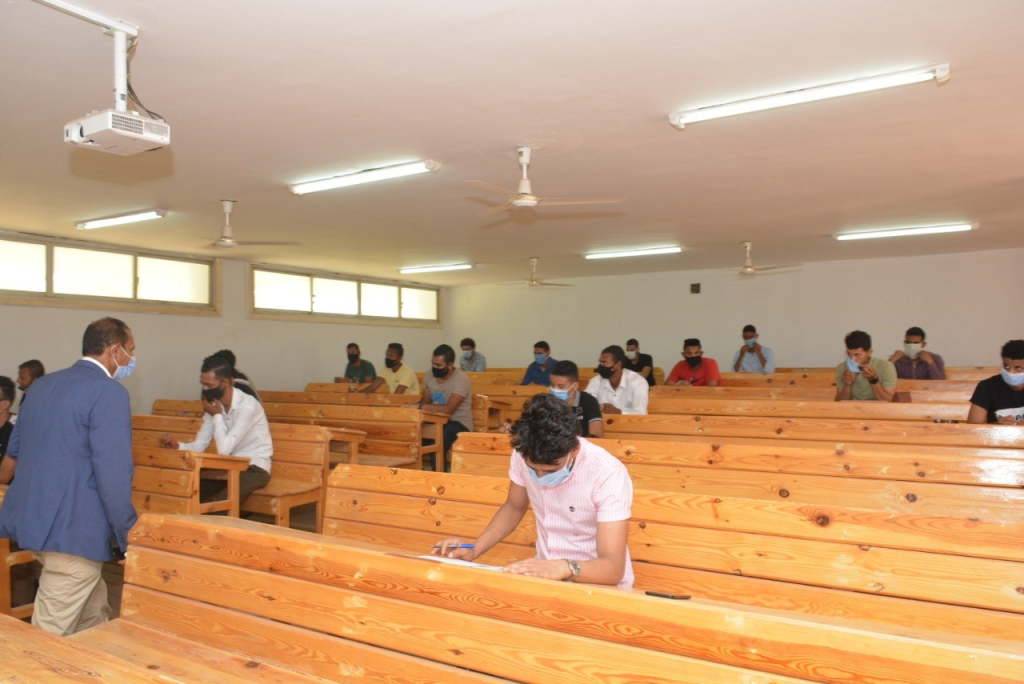 مع مراعاة ارتداء الكمامات الطبية ووجود مسافة التباعد بين الطلاب داخل اللجان وعدم تبادل أدوات الطلاب والقيام بالتعقيم والرش بصفة دائمة .