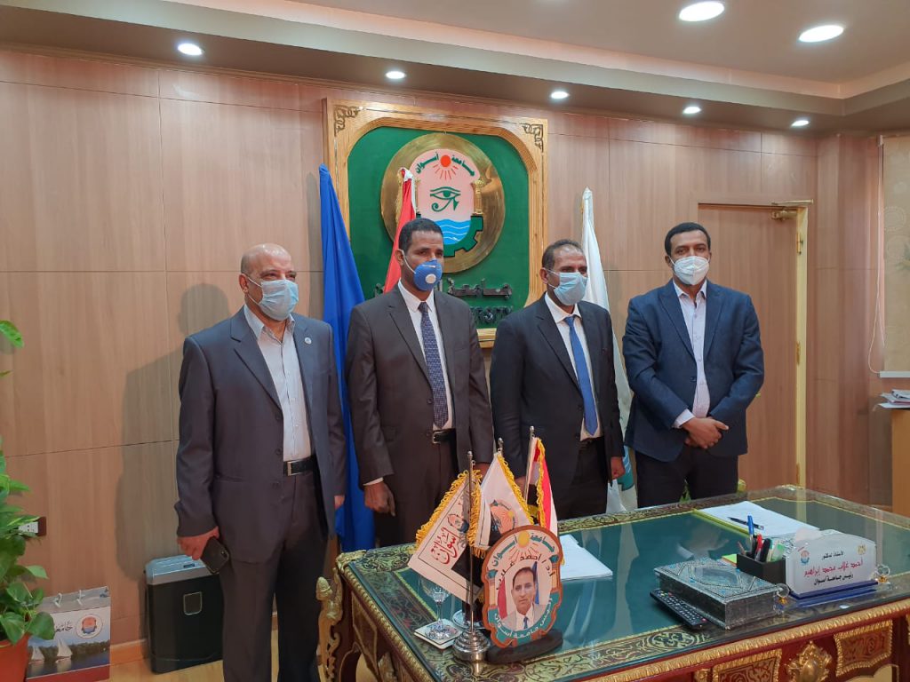 لخدمة المجتمع وتنمية البيئة تم اليوم الأحد الموافق 31 مايو 2020، توقيع بروتوكول تعاون بين جامعة أسوان ووزارة الرى والموارد المائية، بحضور المهندس/ محمد على إبراهيم الشرونى – وكيل وزارة الرى بأسوان ، ورئيس الإدارة المركزية، بحضور الأستاذ الدكتور/ أيمن عثمان – نائب رئيس الجامعة لشئون الدراسات العليا والبحوث، والدكتور/ محمد زكريا – مدير المركز .